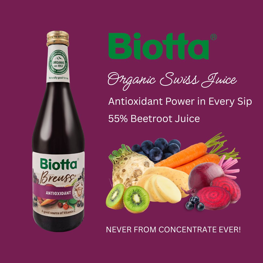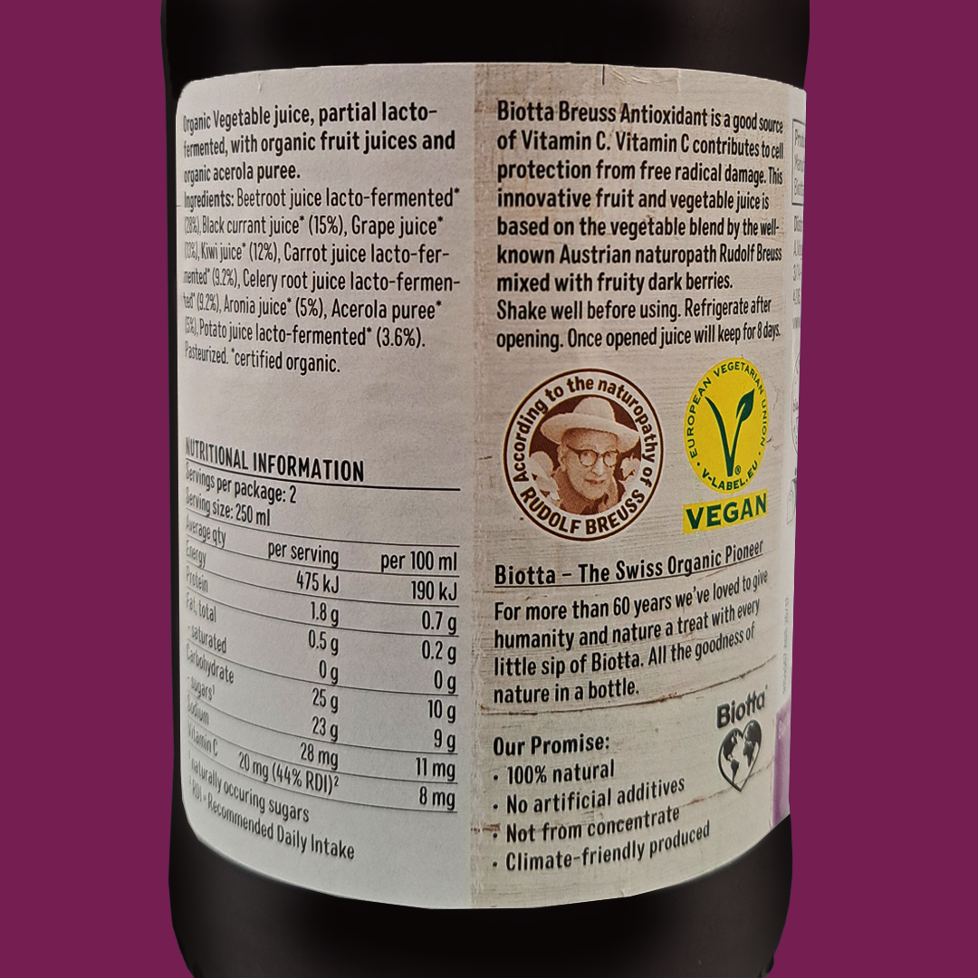 Biotta Organic Breuss Antioxidant Juice is a balanced blend of cold pressed vegetable and fruit juices. Developed in direct consultation with the famous Austrian Naturopath Rudolf Breuss. Cold Pressed and Lacto-fermented from Organically Farmed beetroot, carrots, celery, potatoes (all lacto-fermented), kiwis, grapes, cassis, Aronia, and acerola. The exact recipe of this juice remains our well-kept secret. This juice is a good source of Vitamin C. a natural antioxidant that contributes to cell protection from free radical damage.